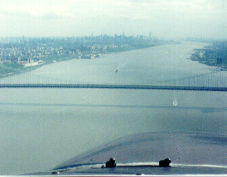 Heading south down the west bank of the Hudson River; approaching the George Washington Bridge; called the "GWB". Flying at 800 feet, self announcing type, position, direction, speed, and altitude every so often on the radio.